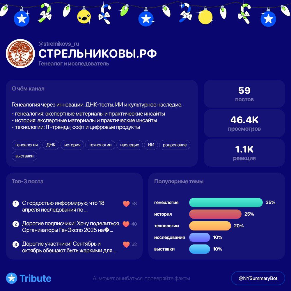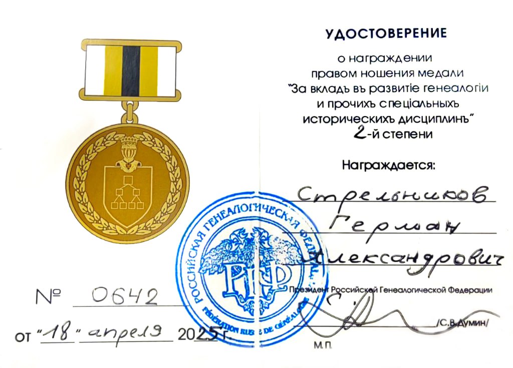 1.на сайте было опубликовано одно из самых интересных и долгожданных исследований, которое объединило ранее разрозненных потомков со своими родовыми древами - это статья Трубицына Андрея "Стрельниковы Денисовичи", в которой научно был обоснован единый предок (упоминаемый в конце 16-начале 17 века по Калуге) с потомками расселившимися в течение 17-19 веков в Елецком, Талецком, Задонском, Усманском, Бобровском, Бузулукском, Канском уездах и на Лабинской засеченой линии (будущей территории современного Краснодарского края) и несчитаного количества современников. В наступающем 2026 году за свои многолетние исследования Андрей становиться первым лауреатом на премию нашего проекта!