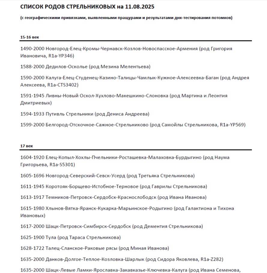 5.важным предметным результатом проекта стал также переработанный и опубликованный на всех площадках, где представлен наш проект, новый СПИСОК родов Стрельниковых (ссылка на канал в ТГ), который к концу 2025 года насчитывал 50 различных родов и позволяет неограниченному кругу лиц самостоятельно исследовать происхождение предков из числа Стрельниковых вглубь времен до 15-16 веков!